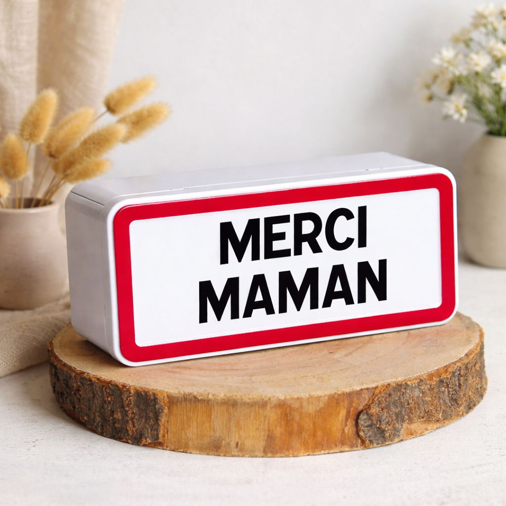 Vous êtes fiers de votre maman ? Laissez-nous vous présenter la boîte IDEALE pour vous : la boîte MERCI MAMAN! En forme de panneau entrée de ville, vous pourrez ainsi personnaliser ce support en y inscrivant le nom de votre mère ou un message court.