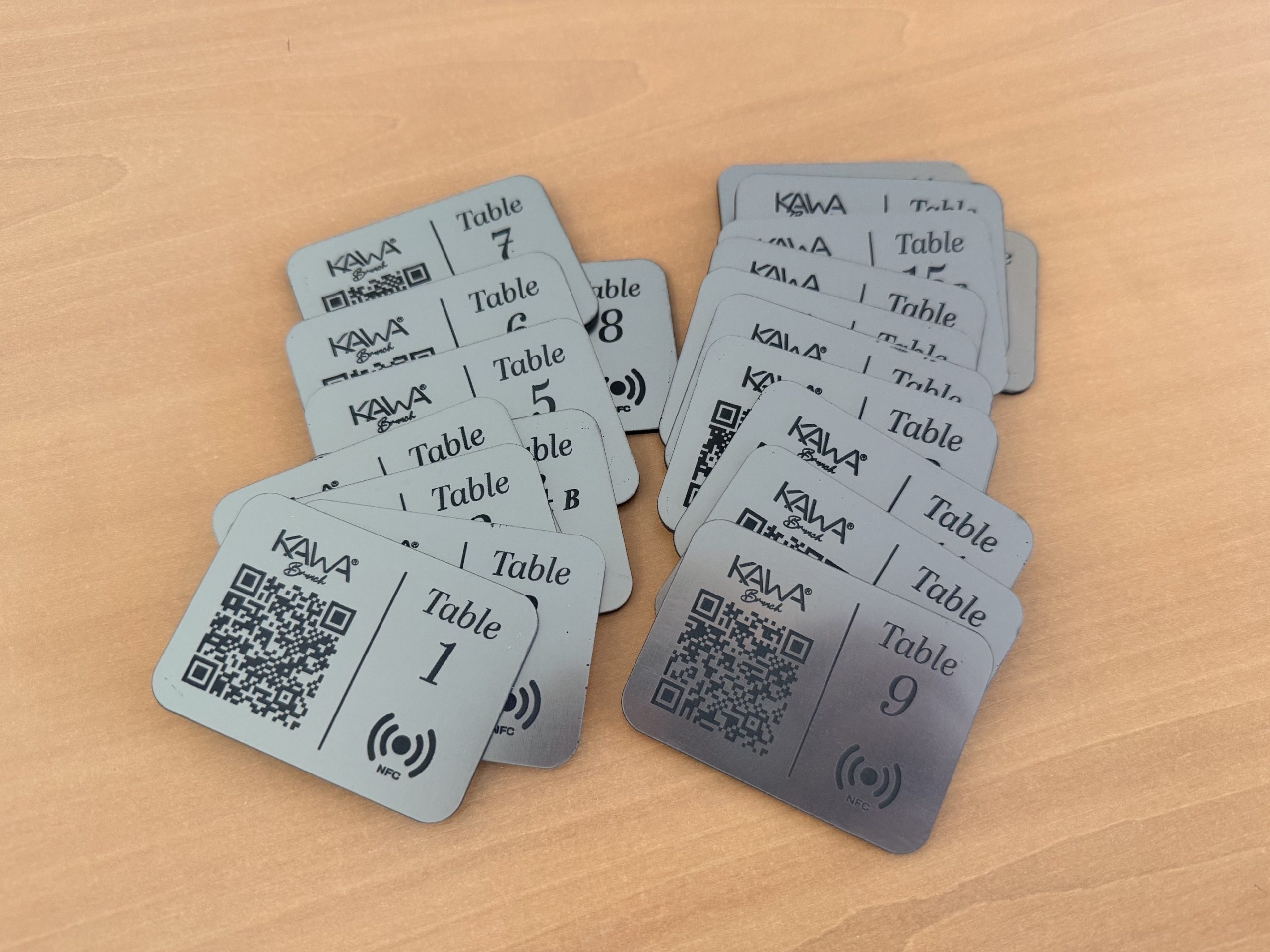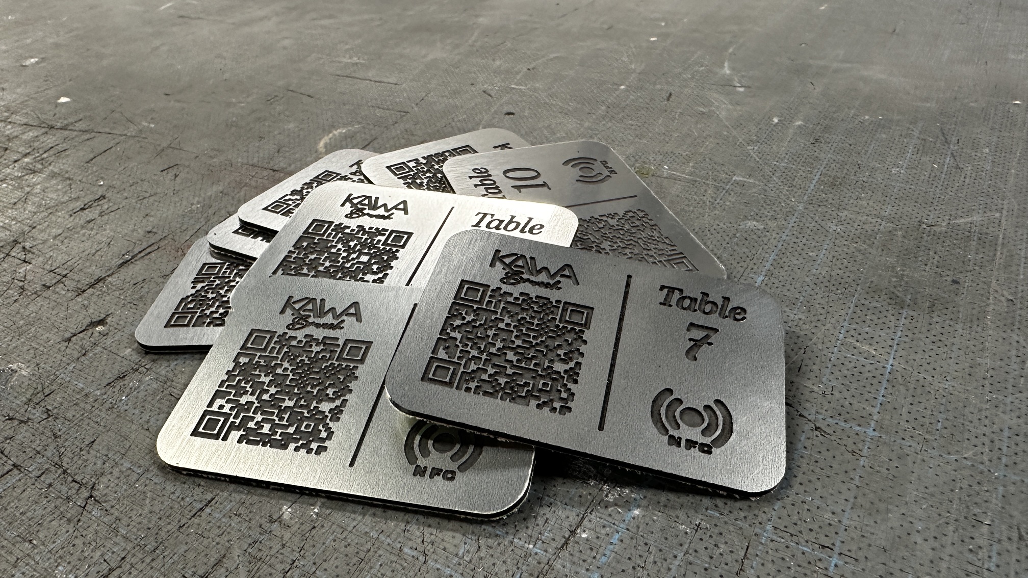 Nous vous proposons des plaques d’identifications avec QR code gravés au laser sur-mesure pour vos tables de restaurant.