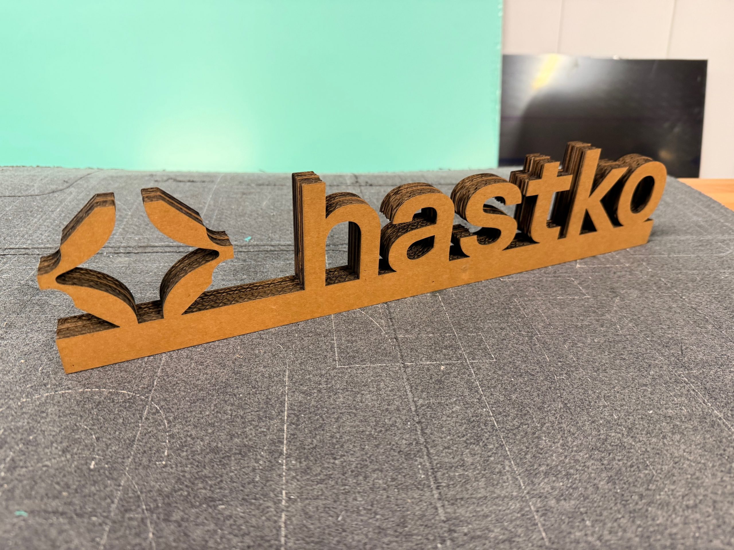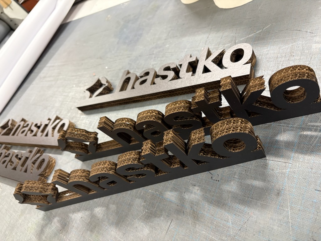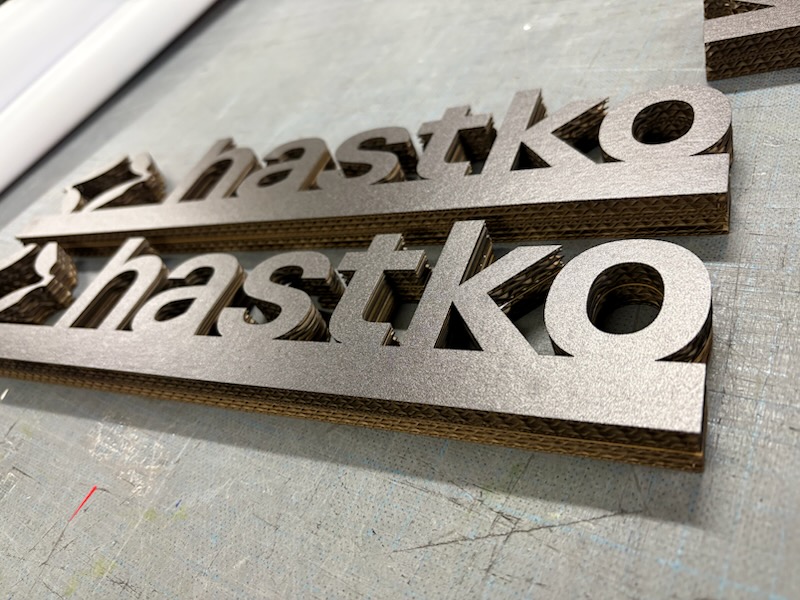 Impression de votre logo signature sur une PLV en carton alvéolaire (multi cannelures) par découpe laser. Le carton multi cannelures est un matériau composé de plusieurs couches de papier collé, formé d’une couche cannelée entre deux couches planes. De part sa composition respectueuse de l’environnement, le carton multi cannelures est une excellente alternative aux plaques en mousse ou à base de plastique. En superposant les couches, vous obtenez une PLV en volume! Idéal pour signature de logos en magasin / boutique.