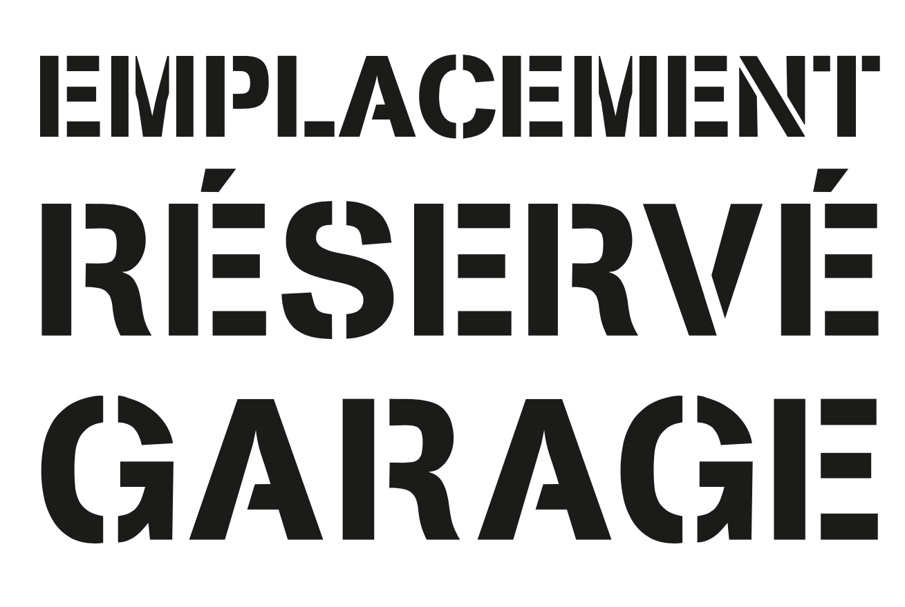 Exemple : parking réservé, emplacement réservé, pochoir de rue, pochoir de marquage au sol, de container maritime, marquage de machines industrielles…